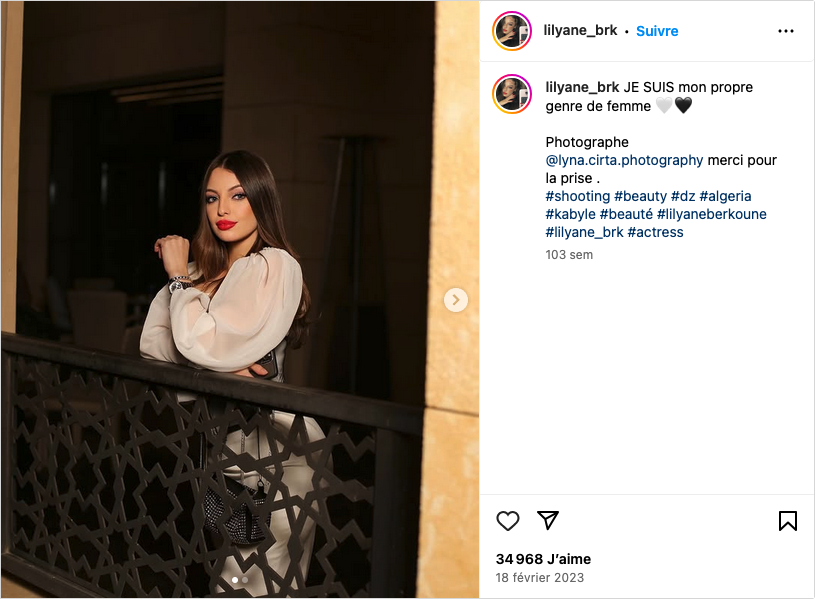 The account’s profile picture of a young woman leaning against a balcony is fake. It was taken from the Instagram post of an Algerian actress dated February 2023, two months prior to the creation of the fake Rwandan account. Apart from the face, which has been altered, the two photos are identical.