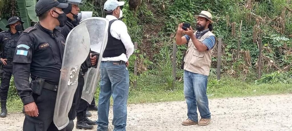 Le journaliste Carlos Choc filmant des manifestations en octobre 2021. (Crédits: Prensa Comunitaria)