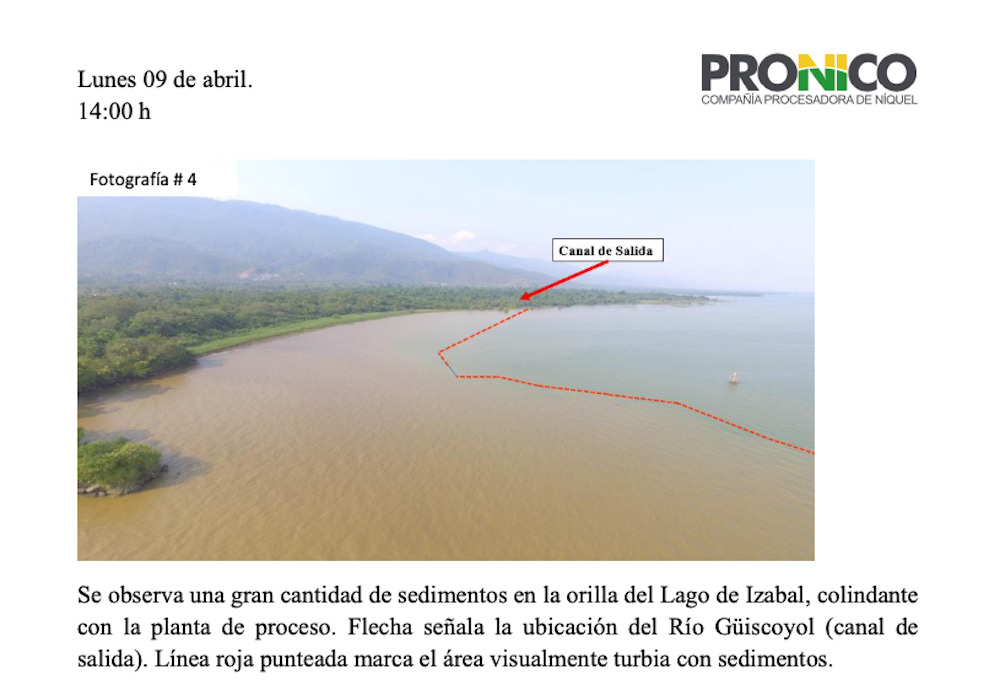 Document issu de la fuite de données à laquelle Forbidden Stories et 20 médias partenaires ont eu accès, intitulé ‘Note de service sur l’état actuel des rives du lac Izabal, embouchure de la rivière Güiscoyol’ – Avril 2018. | Surligné : «Les sédiments de la zone minière, qui, par le biais du ruissellement provoqué par les précipitations (pluie), se déversent dans le micro-bassin de la rivière Güiscoyol et s’écoulent dans le canal de sortie, puis dans le lac.»