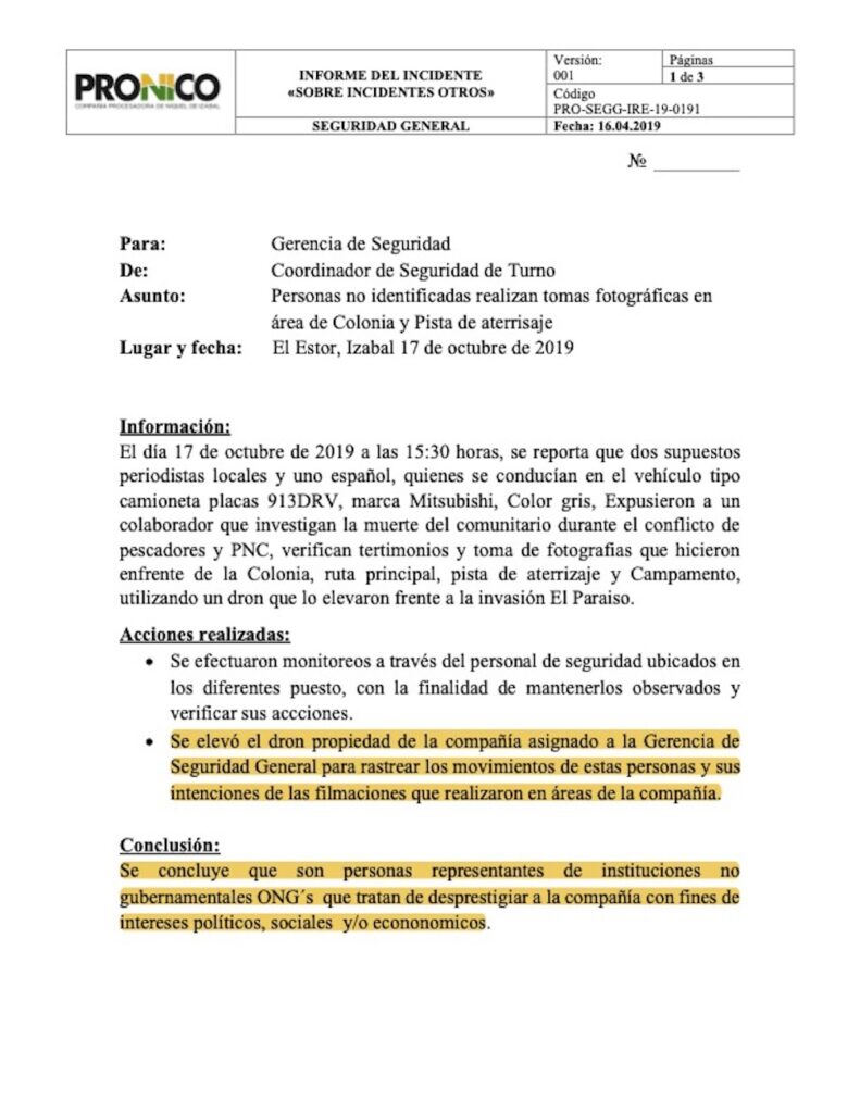«Savoir que je suis photographié est très inquiétant», explique le journaliste en découvrant ces clichés. Avant d’ajouter : «Je suis en réalité très indigné car [la] société minière contrôle non seulement la population d’El Estor dans toutes ses actions, mais aussi la vie des défenseurs [de l’environnement] et surtout la mienne en tant que journaliste.»