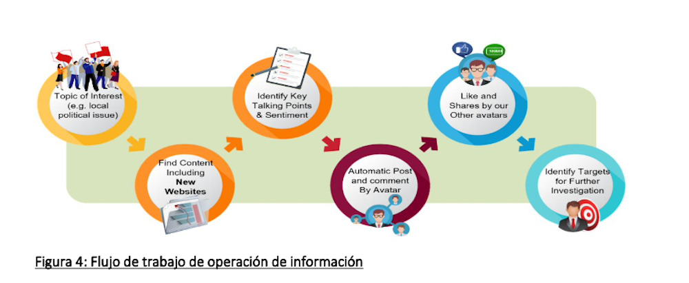 Dans un graphique, l’entreprise explique partir d’une « question politique locale » et « identifier les principaux sujets de discussion et le sentiment général » d’un groupe cible. Ces sujets de discussion sont ensuite partagés sur les réseaux sociaux à l’aide d’un ensemble de faux comptes ou avatars programmés pour liker, partager et commenter les messages les uns des autres. Les avatars se cachent derrière un réseau complexe de proxies, ce qui les rend presque impossibles à détecter par les plateformes comme Facebook ou Twitter.